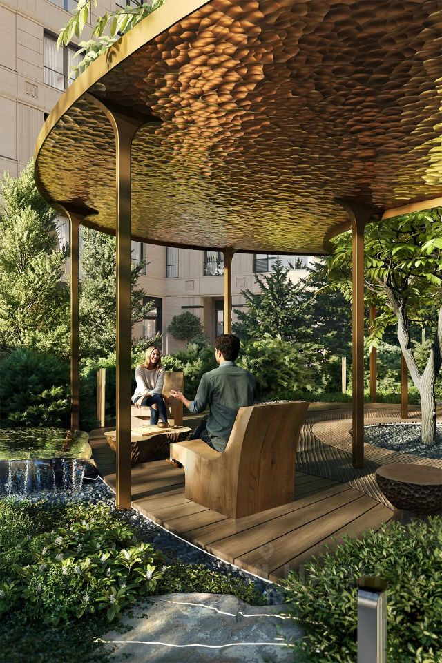 Во дворе дома расположится приватный скандинавский сад Hideaway, созданный студией L.Buro лучшей ландшафтной компанией России 2025 года. В проекте сада объединяются стойкость норманнов и романтизм петербуржцев, северная сдержанность и глубинная чувственность культурной столицы.