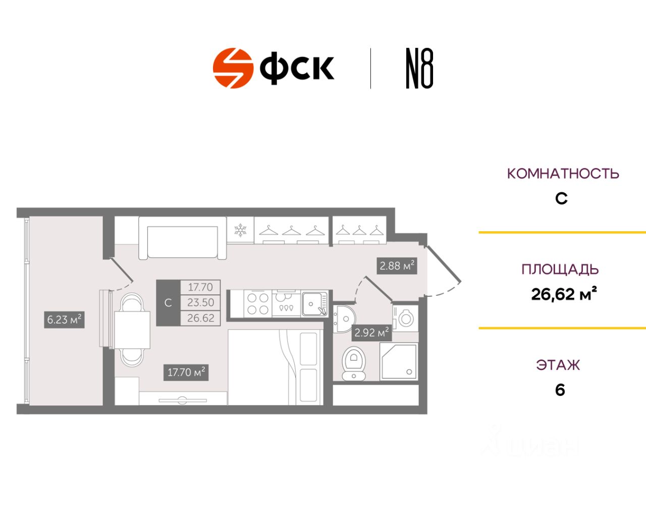 Прямая продажа от застройщика — только в этом месяце. Студия в клубном доме N8 на 6-м этаже. Общая площадь 26,62. Без отделки.