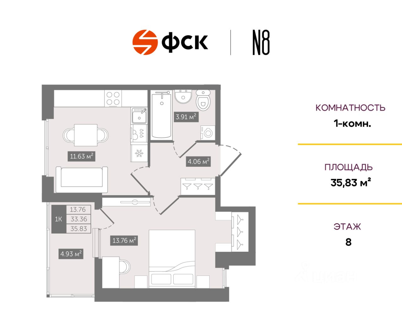 Прямая продажа от застройщика — только в этом месяце. 1-к квартира в клубном доме N8 на 8-м этаже. Общая площадь 35,92. Без отделки.