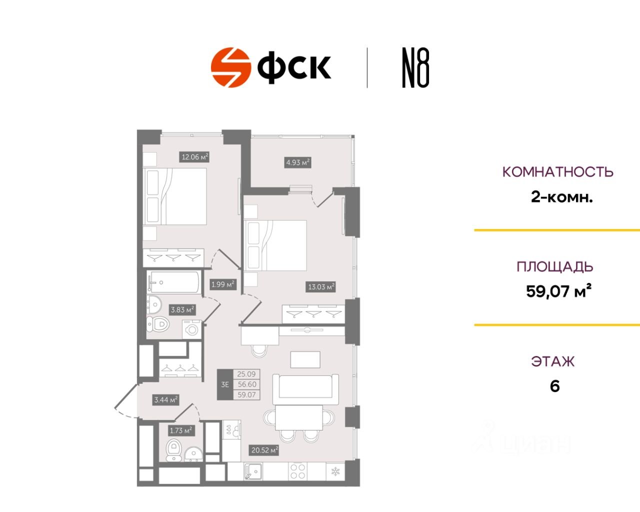 Прямая продажа от застройщика — только в этом месяце. 2-к квартира в клубном доме N8 на 6-м этаже. Общая площадь 59,07. Без отделки.