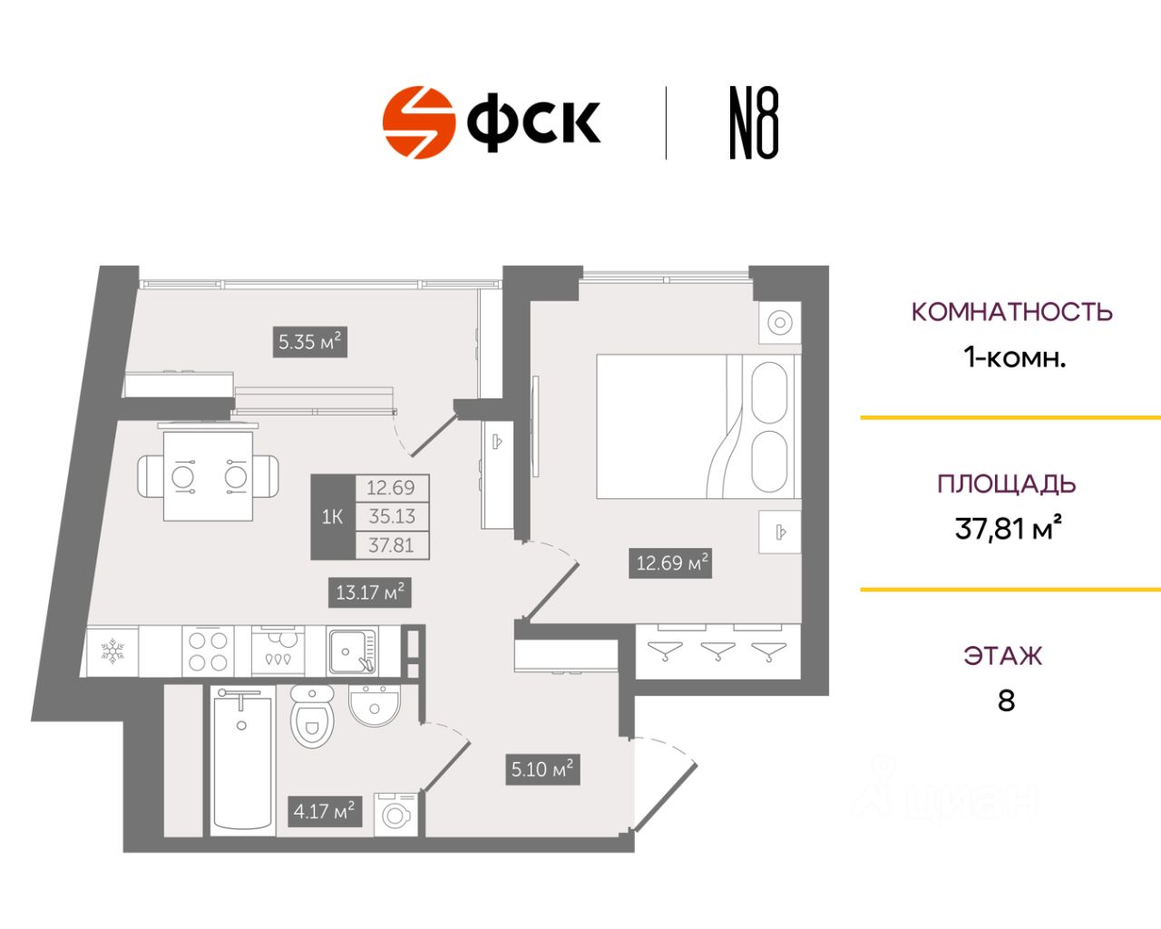 Прямая продажа от застройщика — только в этом месяце. 1-к квартира в клубном доме N8 на 8-м этаже. Общая площадь 37,93. Без отделки.