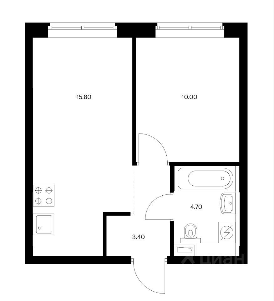 Увеличенные распашные окна в кухне и комнате! Общая площадь 33,9 кв,м Просторная кухня-гостиная 15,8 кв.м Спальня 10 кв.м Большой совмещенный санузел 4,7 кв.м Прихожая с пространством для встроенного шкафа 3,4 кв.м