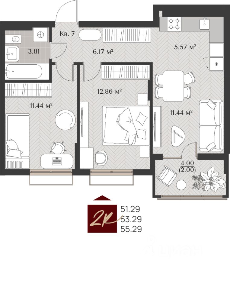 Общая площадь53,29 м2
