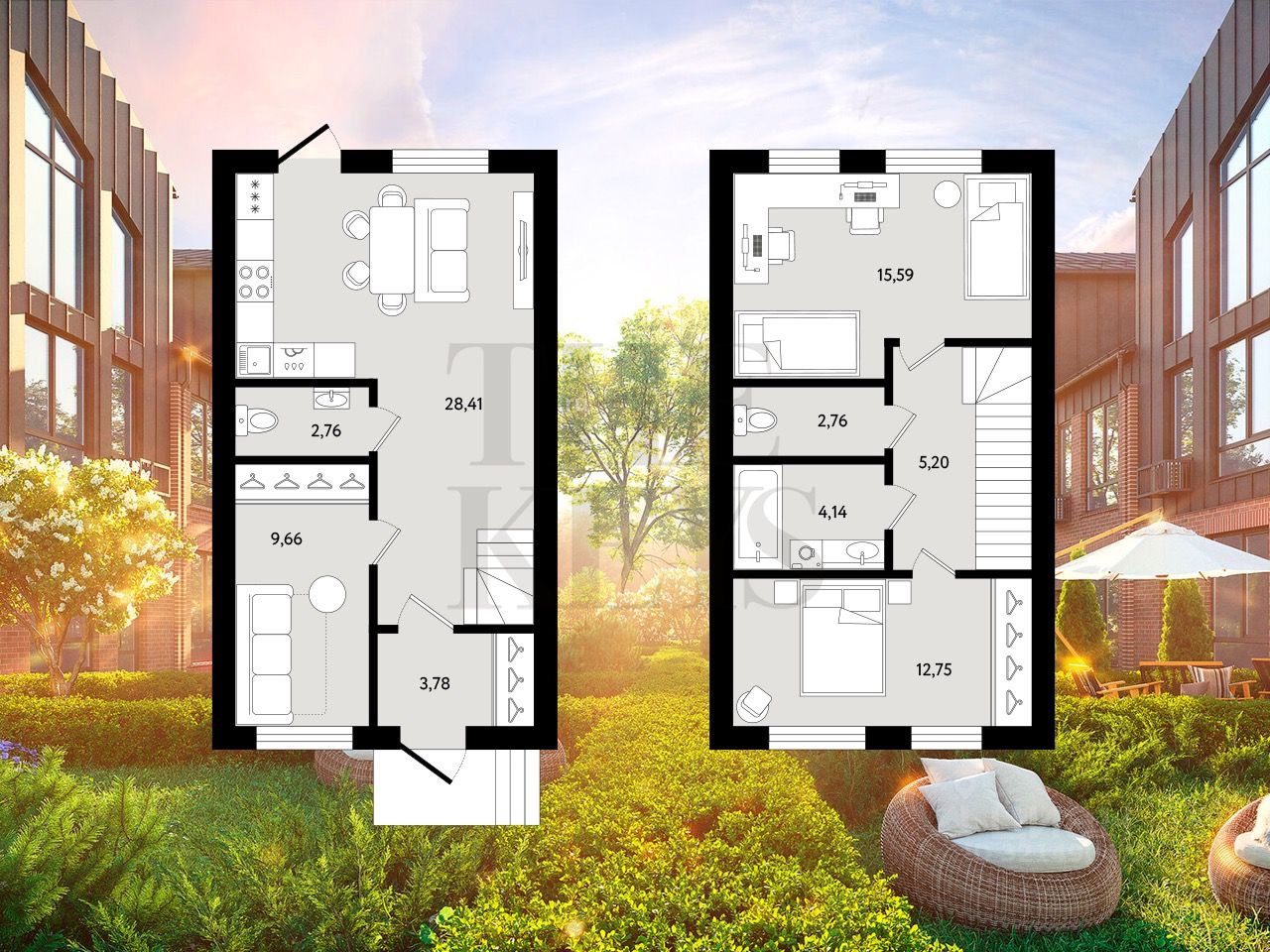 Параметры объекта: - Сквозная планировка с главным входом и выходом на собственный участок - Увеличенные окна на 2 стороны - Высота потолков 3,1 м. - Горизонтальная разводка труб отопления - Первый этаж: Просторная кухня-гостиная 31,78 м. для встречи с самыми близкими Комната 9,66 м. Есть возможность установить камин Совмещенный санузел - Второй этаж: 2 спальни 16,40 м. и 15,75 м. Совмещенный санузел