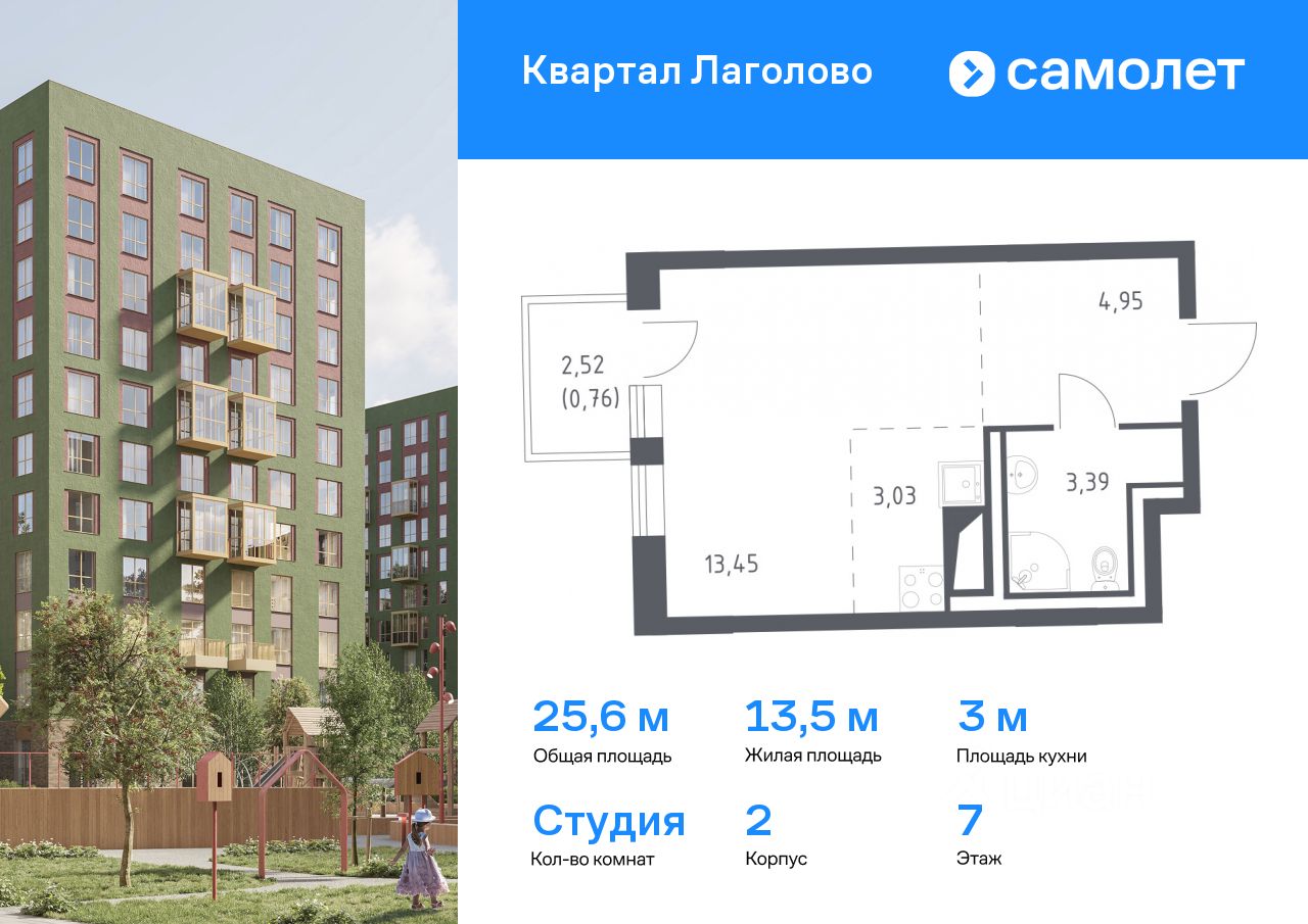 Предлагается квартира студия комфорт-класса 25,58 кв.м в корпусе 2 на 7 этаже, в ЖК ''Квартал Лаголово'' Квартира с чистовой отделкой. Доступность дополнительных опций уточняйте у застройщика.