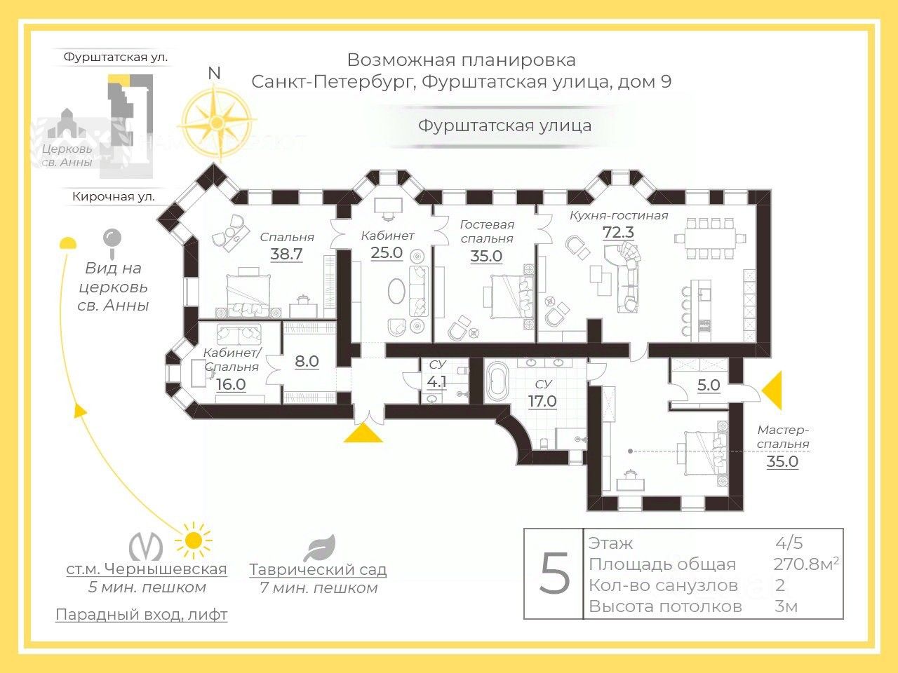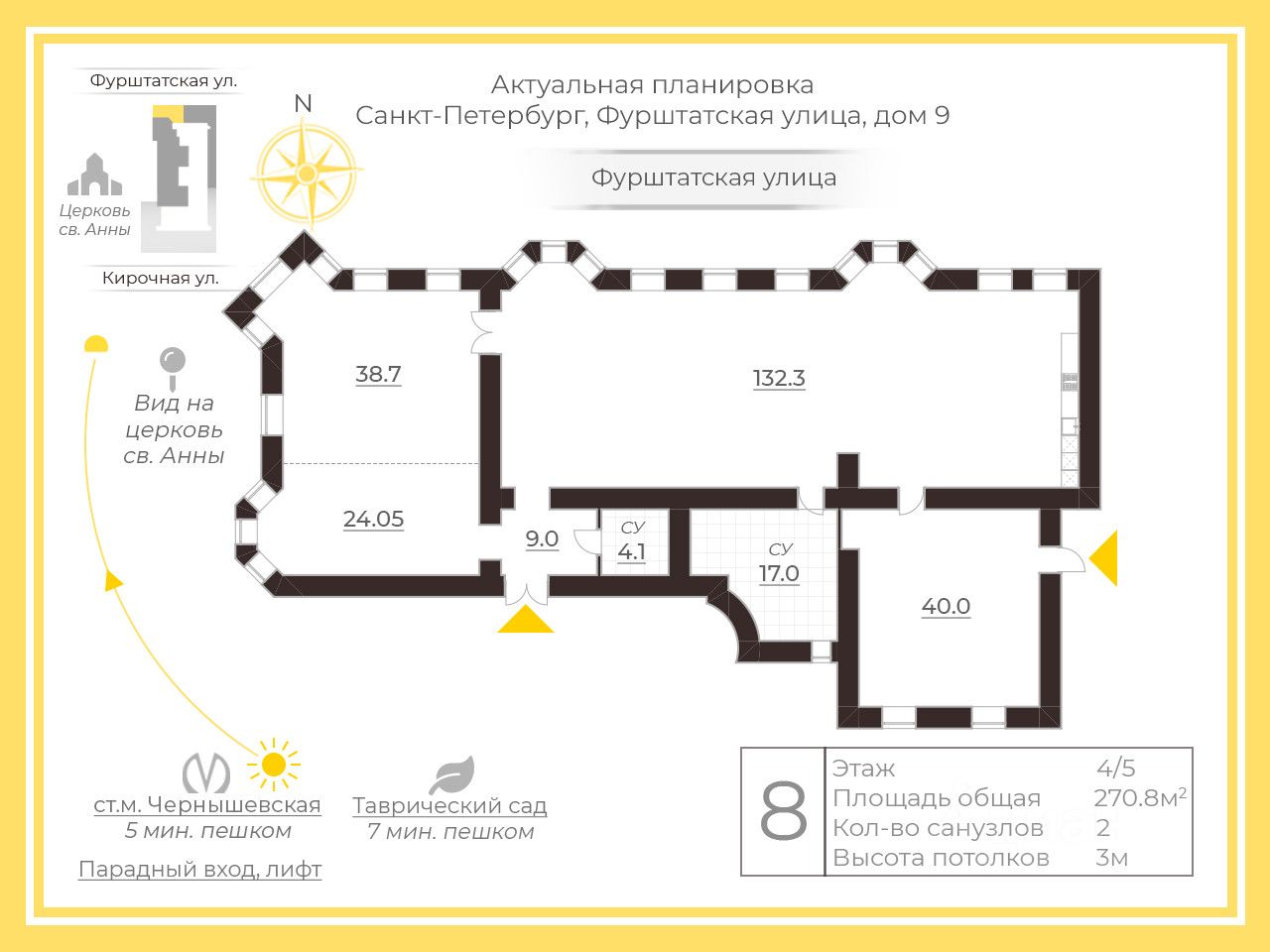 Арт. 117226688 Уникальная квартира на одной из красивейших улиц Петербурга - Фурштатской. Это потрясающей красоты бульвар с зеленой пешеходной зоной, красивыми фонарями и коваными скамейками. Квартира площадью 270 кв.м., расположена на четвёртом этаже. Одиннадцать окон, четыре эркера с супер-видом на Фурштатскую, высокие потолки, ЛИФТ, фантастическая парадная, охрана и консьерж. Это не среднестатистическая большая квартира в центре. Это квартира с выдающимися характеристиками: - Дом с великолепным фасадом и без коммунальных квартир. - На первом этаже дома уже более 15 лет расположено консульство Испании. Круглосуточная охрана и видеонаблюдение прямо у парадной. - Парадная с дубовыми дверьми, кованными люстрами и широкой лестницей достойна отдельного внимания. Идеальная чистота, современный ЛИФТ, Дежурит консьерж, никаких коммунальных квартир - всё это каждый день будет задавать настроение и напоминать, что вы сделали правильный выбор. - Во дворе дома предусмотрены парковочные места под камерами. - Двусторонняя планировка, 4 эркера, много больших окон. - Виды из окон и эркеров на бульвар просто завораживают. Возможно сделать великолепную планировку с четырьмя спальнями, двумя санузлами Все стены под покраску, на полу паркет. Полы с подогревом и кондиционеры. В доме прошел капитальный ремонт всех инженерных систем в 2019 году