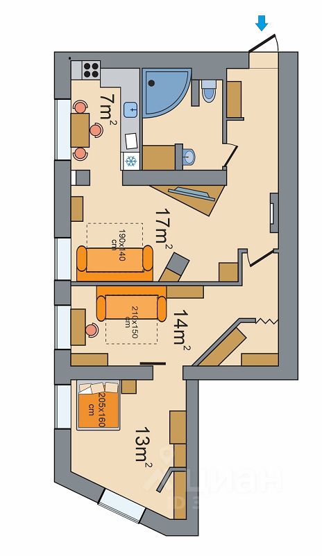 В квартире сделан косметический ремонт, поэтому она выглядит свежо и аккуратно. В комнатах и на кухне есть необходимая мебель, включая удобные диваны и шкафы. Для вашего комфорта установлена современная техника: холодильник, телевизор и стиральная машина. В совмещенном санузле располагаются туалет, стиральная машина и ванна, в которой можно расслабиться после долгого дня.
