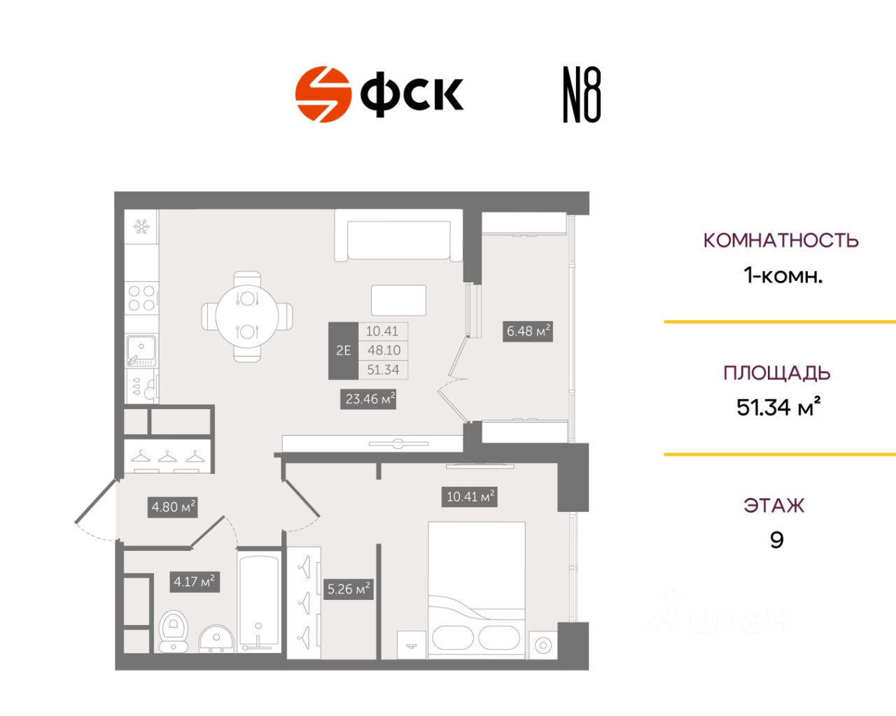 Прямая продажа от застройщика — только в этом месяце. 1-к квартира в клубном доме N8 на 9-м этаже. Общая площадь 51,34. Без отделки.