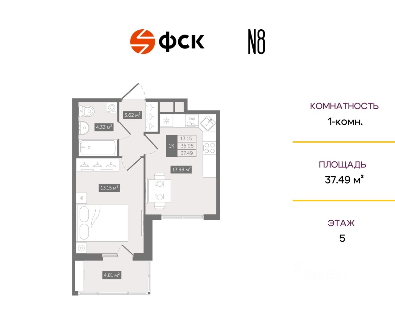 Прямая продажа от застройщика — только в этом месяце. 1-к квартира в клубном доме N8 на 5-м этаже. Общая площадь 37,49. Без отделки.