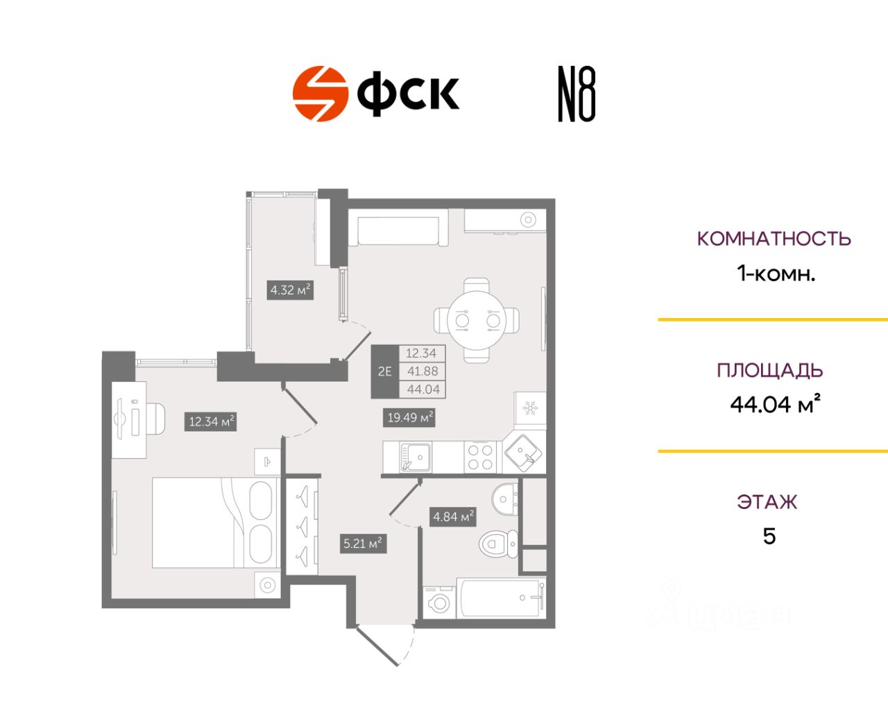 Прямая продажа от застройщика — только в этом месяце. 1-к квартира в клубном доме N8 на 5-м этаже. Общая площадь 44,04. Без отделки.