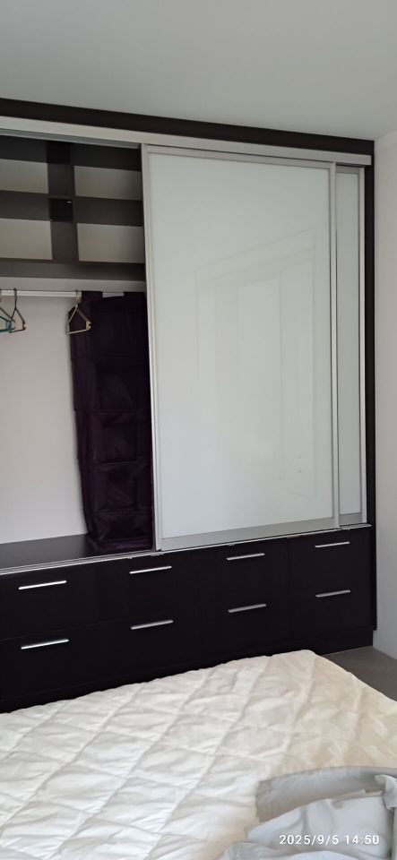 Огромная проходная гостиная с ТВ и диваном (не раскладной) в спальне двуспальная кровать 200*200, шкафы. Два шкафа купе