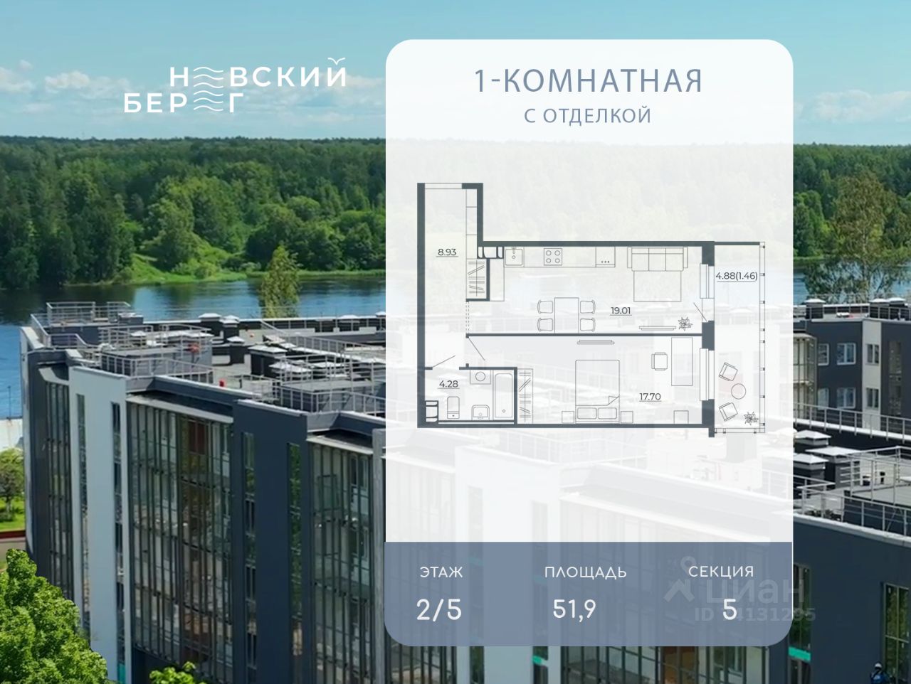 Прoдaется 1-комнатная квартира на 2 этаже 5-этажного дома в ЖК ''Невский берег''. Общая площадь квартиры составляет 51,90 кв.м. Номер квартиры 100. ''Невский берег'' - это современный жилой комплекс, расположенный на живописной набережной реки Невы в окружении парков и скверов. Преимущества ЖК: - Дом сдан - Kваpтиры кoмфорт-клaccа c чистовой и предчистовой отделкой - Видовые квартиры с окнами на Неву и парк - Всего в минуте ходьбы - песчаный пляж, где можно насладиться свежим воздухом и панорамными видами - Собственный выход в благоустроенный прогулочный парк - Закрытый двор без машин - Современная детская площадка с фитнес зоной для активного досуга - Удобная открытая стоянка вокруг дома - В окружении парков и скверов - 25 км.