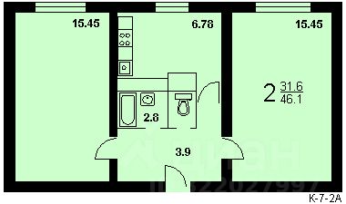 Продам удобную двухкомнатную квартиру 46,1 кв.м. Две изолированные комнаты по 15,8 кв.м. каждая, кухня 6,8 кв.м., раздельный санузел. Комнаты расположены с двух сторон от кухни. Окна выходят в зеленый двор. Солнышко в первую половину дня.