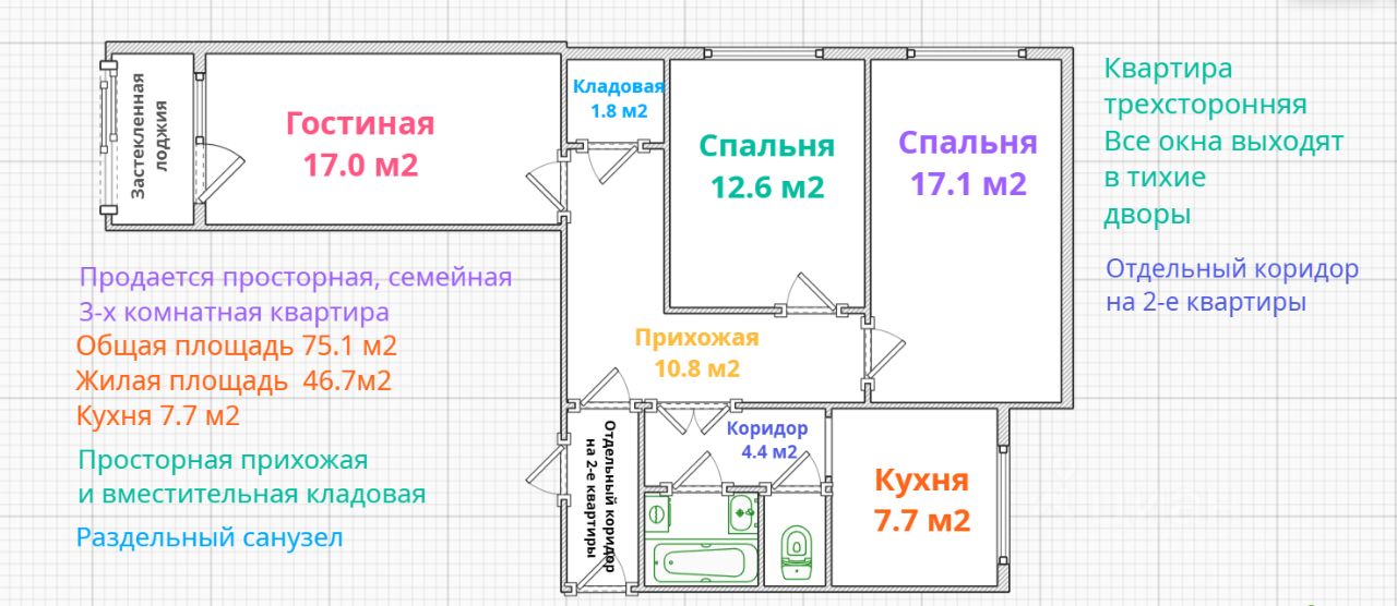 Квартира находится в собственности одной семьи более 20-и лет. Несовершеннолетних собственников нет, МСК не использовался. Документы готовы для выхода на сделку. У нас альтернативная продажа. Мы ждём будущих владельцев квартиры на просмотры, которые проводим по предварительному согласованию. Рассмотрим Покупателей с наличными и с ипотечными средствами.