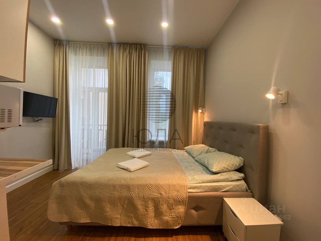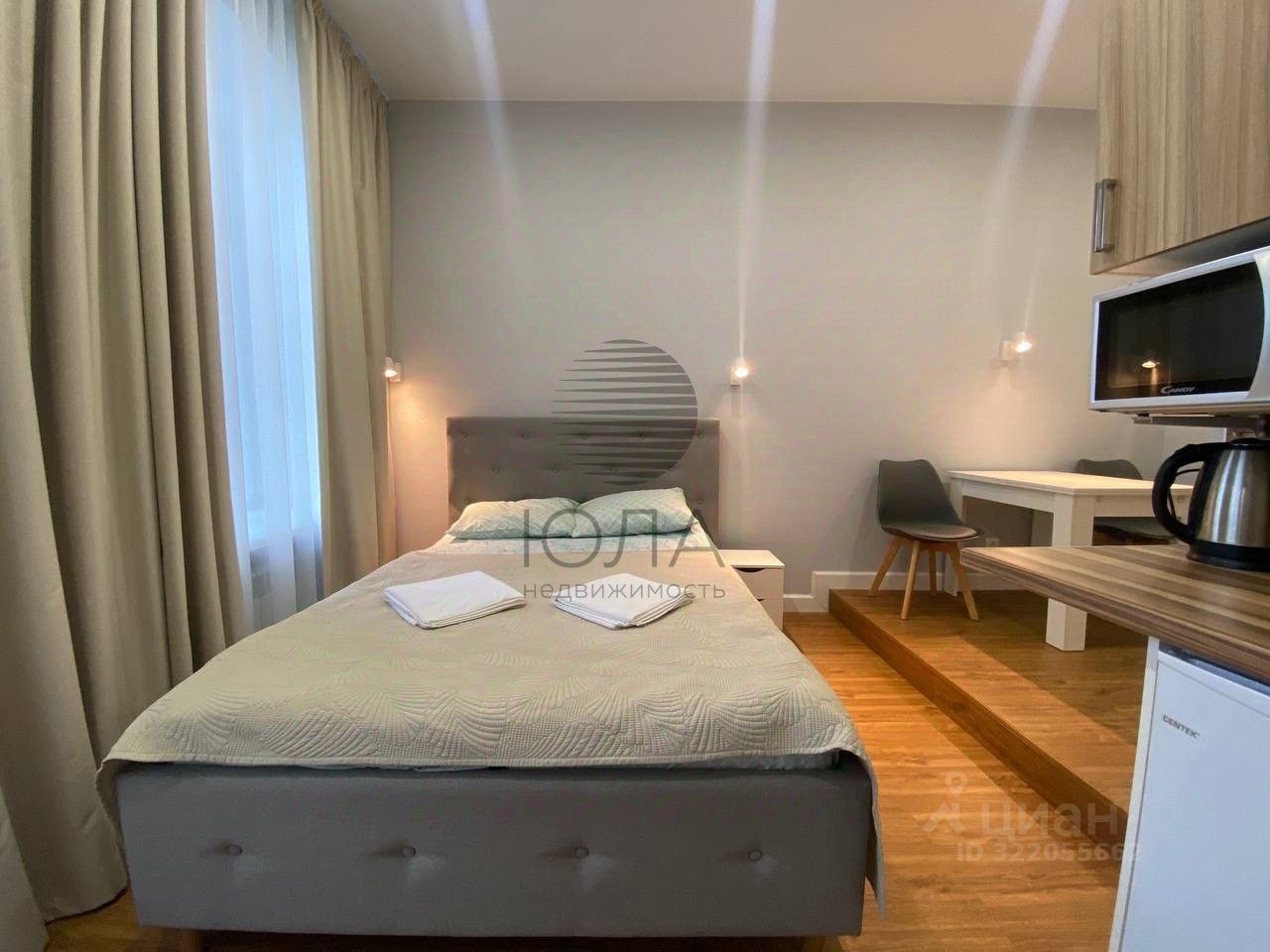 О СТУДИИ: В студии выполнен качественный дизайнерский ремонт, оборудована всей необходимой мебелью и техникой: кровать с комплектами постельного белья, телевизор, стол, за которым можно и работать, стулья, плита, холодильник, кухонный гарнитур, места для хранения. Совмещенный санузел.