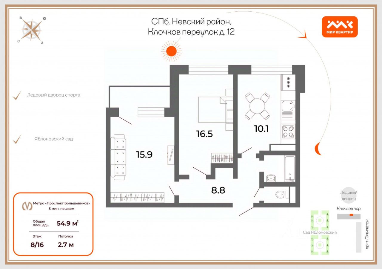 Квартира расположена на 8 этаже. Вид на Ледовый дворец. Две комнаты 16,5 и 15,9 кв.м. Кухня 10,1 кв.м. Закрытый тамбур на две квартиры.