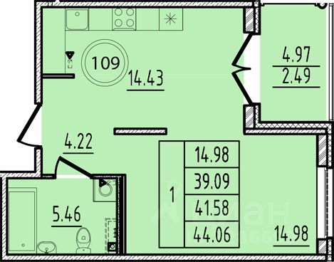 Общая площадь39,09 м2