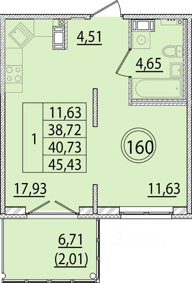 Общая площадь38,72 м2