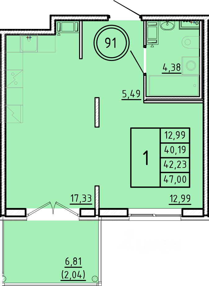 Общая площадь40,19 м2