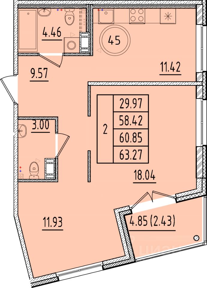 Общая площадь58,42 м2