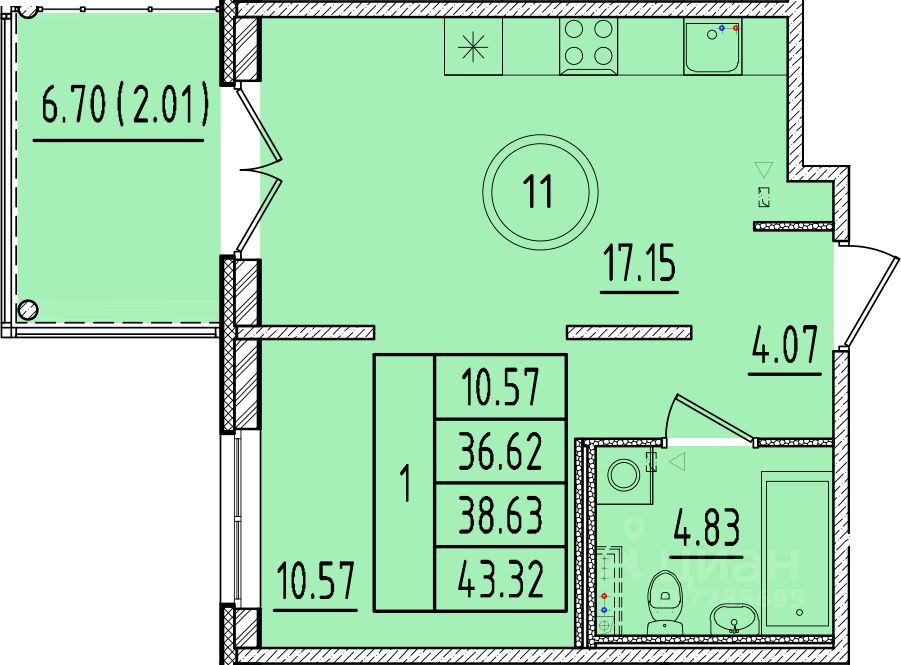 Общая площадь36,62 м2