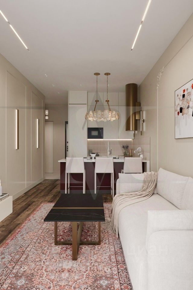 Квартира с новой мебелью, кухонным гарнитуром и техникой. Планировка: кухня-гостиная, изолированная спальня, санузла и гардеробная. Высота потолков 3 метра.