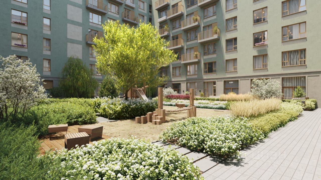 Смысловая ось квартала — широкая главная улица с высаженными вдоль неё высокими деревьями. Они создают тень и работают как шумо- и пылезащитные экраны. Это место сосредоточения основных пешеходных и транспортных потоков, на сторону которых мы ориентировали большинство коммерческих помещений. Отсюда жители могут свернуть на тихие соседские улицы и попасть на внутриквартальную площадь — ещё одну точку притяжения. #ZM4bVB
