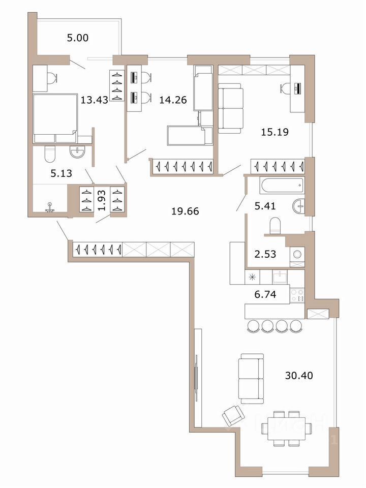 Квартира по проекту имеет три санузла, один из которых относится к мастер-спальне,