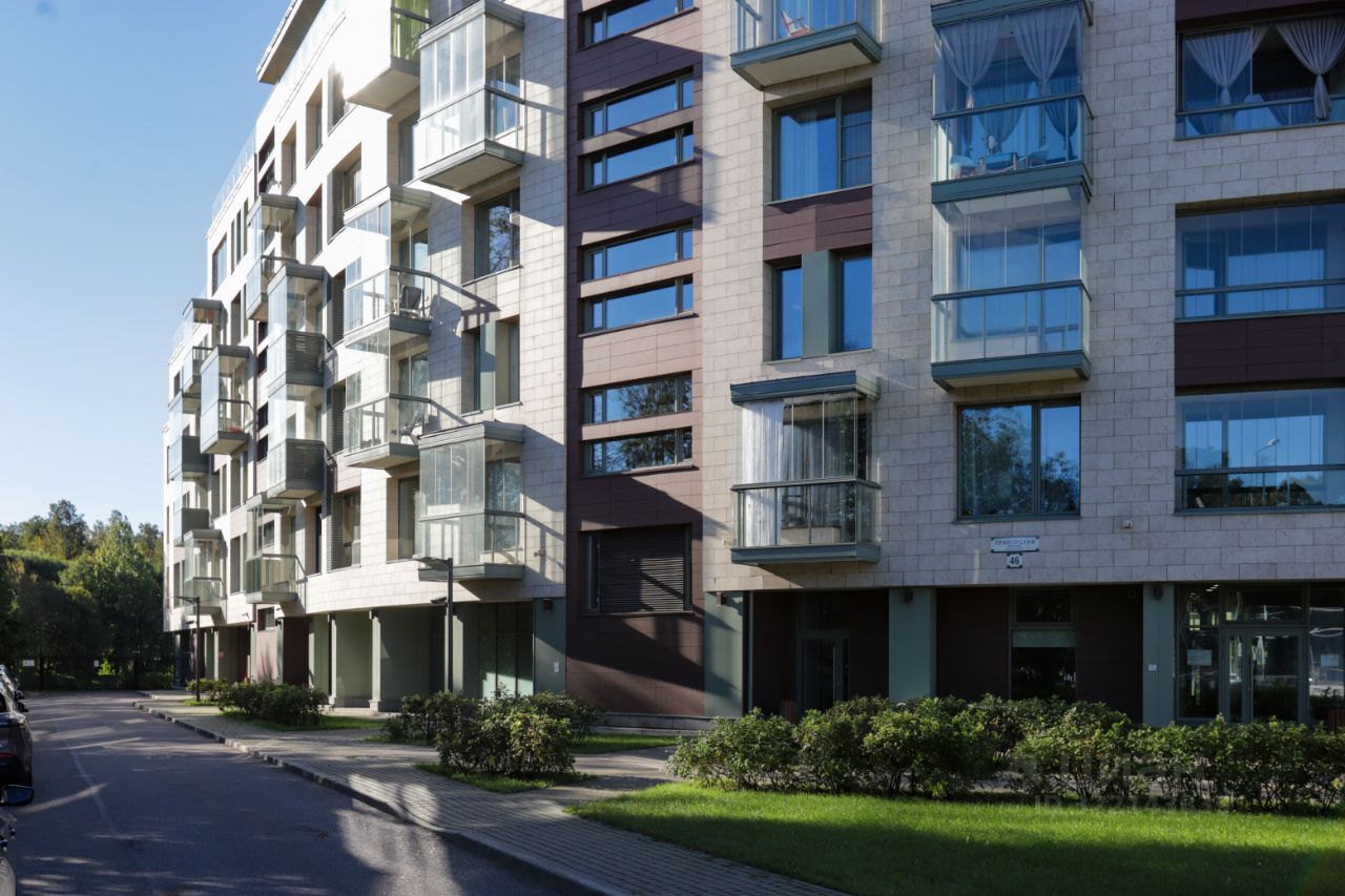 Квартира без внутренний отделки. Панорамное остекление, окна на две стороны — с видом на Елагин остров и Большую Невку, с одной стороны, и на Приморский проспект — с другой. Есть лоджия и балкон с безрамочным остеклением Lumоn. Высота потолка 3,2 метра.