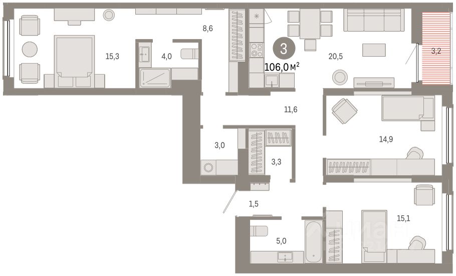 Квартира с кухней-гостиной и тремя спальнями в Кварталах Драверта. Особенности планировки: окна на две стороны, предчистовая отделка, разнесённые спальни, тёплая лоджия. квартиры в нашей базе: ДВТ06-Ж1.6.7.