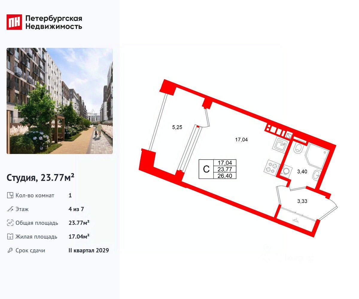 Удобная, классическая, функциональная европланировка, просторная прихожая 3.33 м². Общая площадь студии - 23.77 м², жилая 17.04 м², высота потолка 3 м.