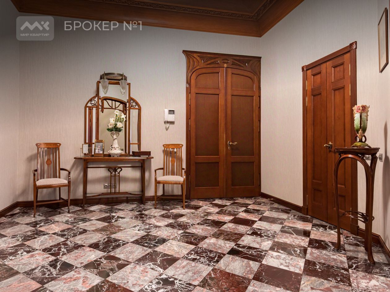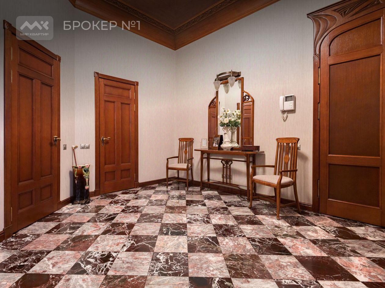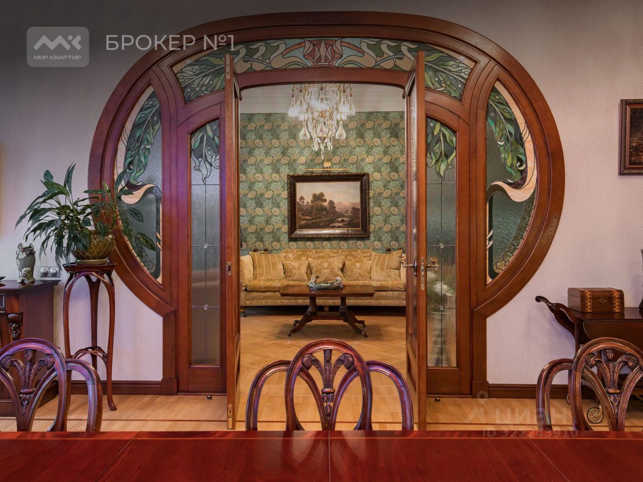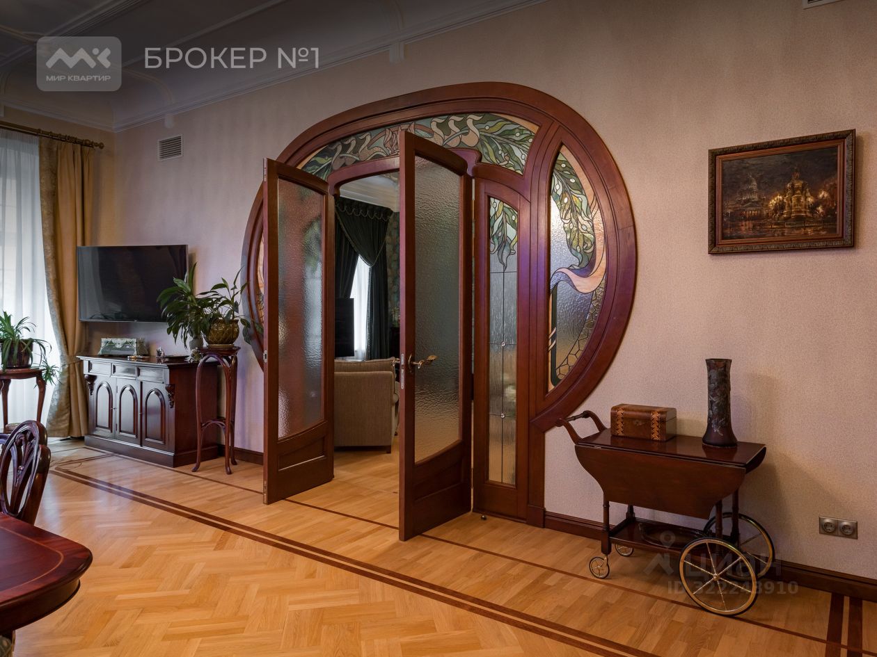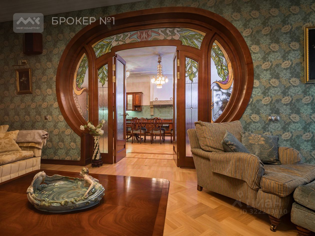 Авторский ремонт в стиле модерн поражает изысканностью: потолки с искусной росписью под дерево, лепнина в каждой комнате, люстры, выполненные на заказ, мраморные подоконники и витражи ручной работы, созданные известной петербургской художницей.