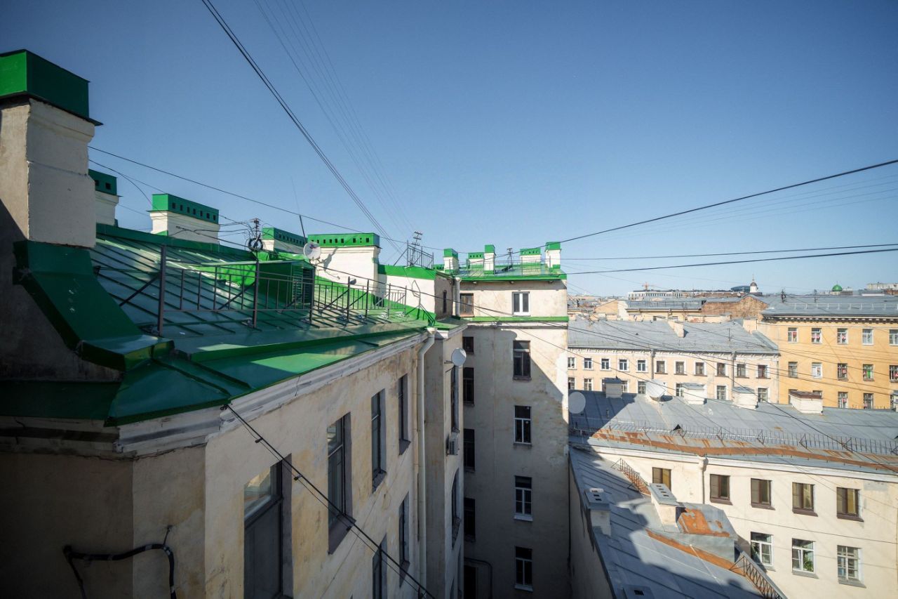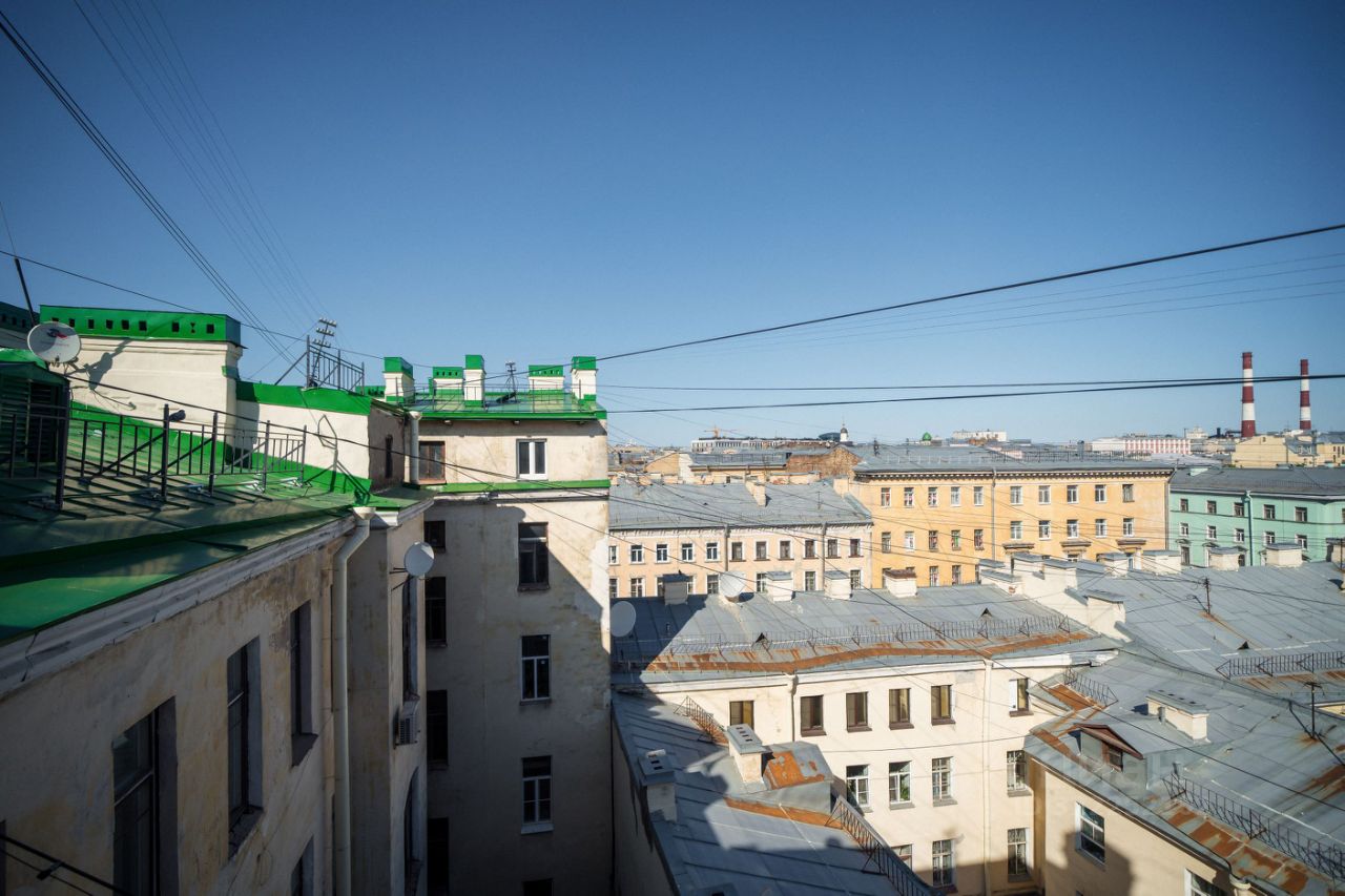 Большие окна открывают потрясающий вид на крыши домов и панораму города.