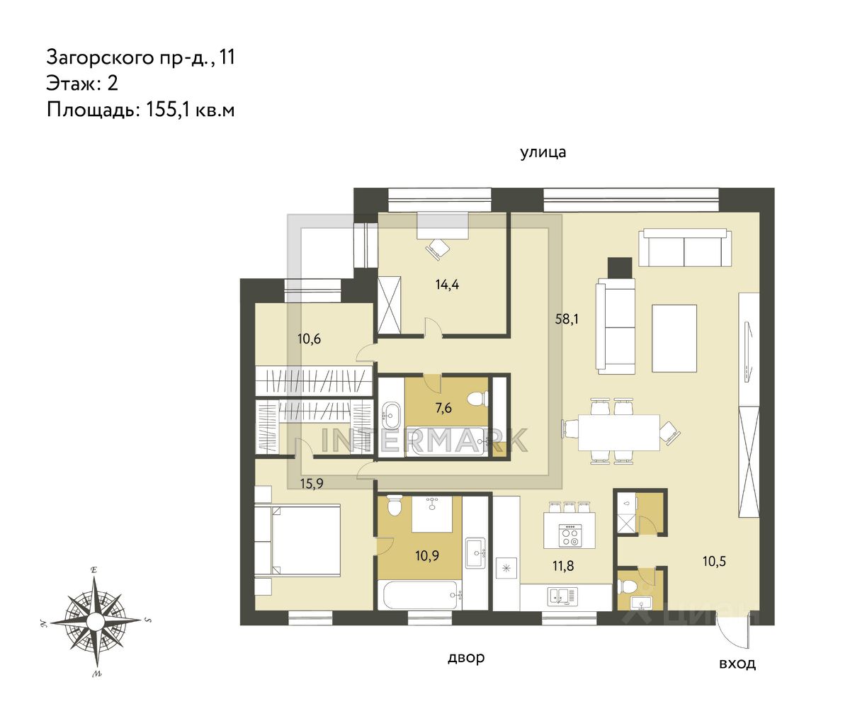 ID 64981: Эксклюзив. Только в Intermark. Прямой представитель собственника. Редкое предложение в прекрасной локации. Предлагается неповторимая, солнечная квартира с тремя спальнями в премиальном жилом комплексе по адресу: проезд Загорского, д. 11. Общая площадь 155.1 кв.м. Расположена на втором этаже современного клубного дома. В ЖК закрытый двор, круглосуточная охрана, система видеонаблюдения, подземный паркинг. Квартира обладает отличной планировкой: просторная залитая солнцем гостиная, кухонная зона, оборудованная всей необходимой техникой, далее мастер-блок: спальня, большая ванная комната с ванной и душевой кабиной, гардеробная, 2 спальни со своим сан. узлом. Также имеется отдельный гостевой туалет и постирочная комната. В квартире выполнен ремонт европейского уровня согласно профессиональному дизайн-проекту, красивый деревянный пол, высококлассное оборудование, современный стиль. Прекрасные виды на парк, зелень, бегают белочки. Также для вашего комфорта вы можете приобрести одно м/м в подземном гараже дома. Дом расположен в очень тихом и зеленом проезде. В квартире абсолютная тишина. Внутри комплекса, между секциями, имеются благоустроенные уютные дворики. Подъезды, лифты все очень ухоженное. Комплекс оборудован современными инженерными системами. Прекрасная логистика до центра города, до парковых зон и всех объектов инфраструктуры, близость к культурным достопримечательностям, лучшим детским садам и школам, спортивным учреждениям, магазинам и супермаркетам. ЖК ''Загорского 11'' - это престиж, комфорт, тишина, спокойствие и безопасность. Один собственник, полная стоимость в ДКП
