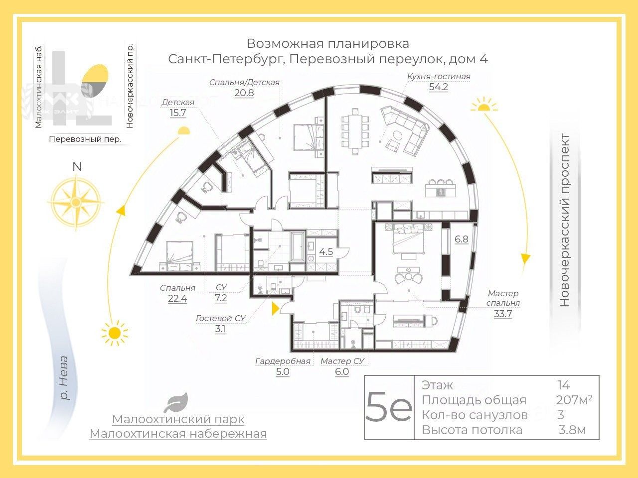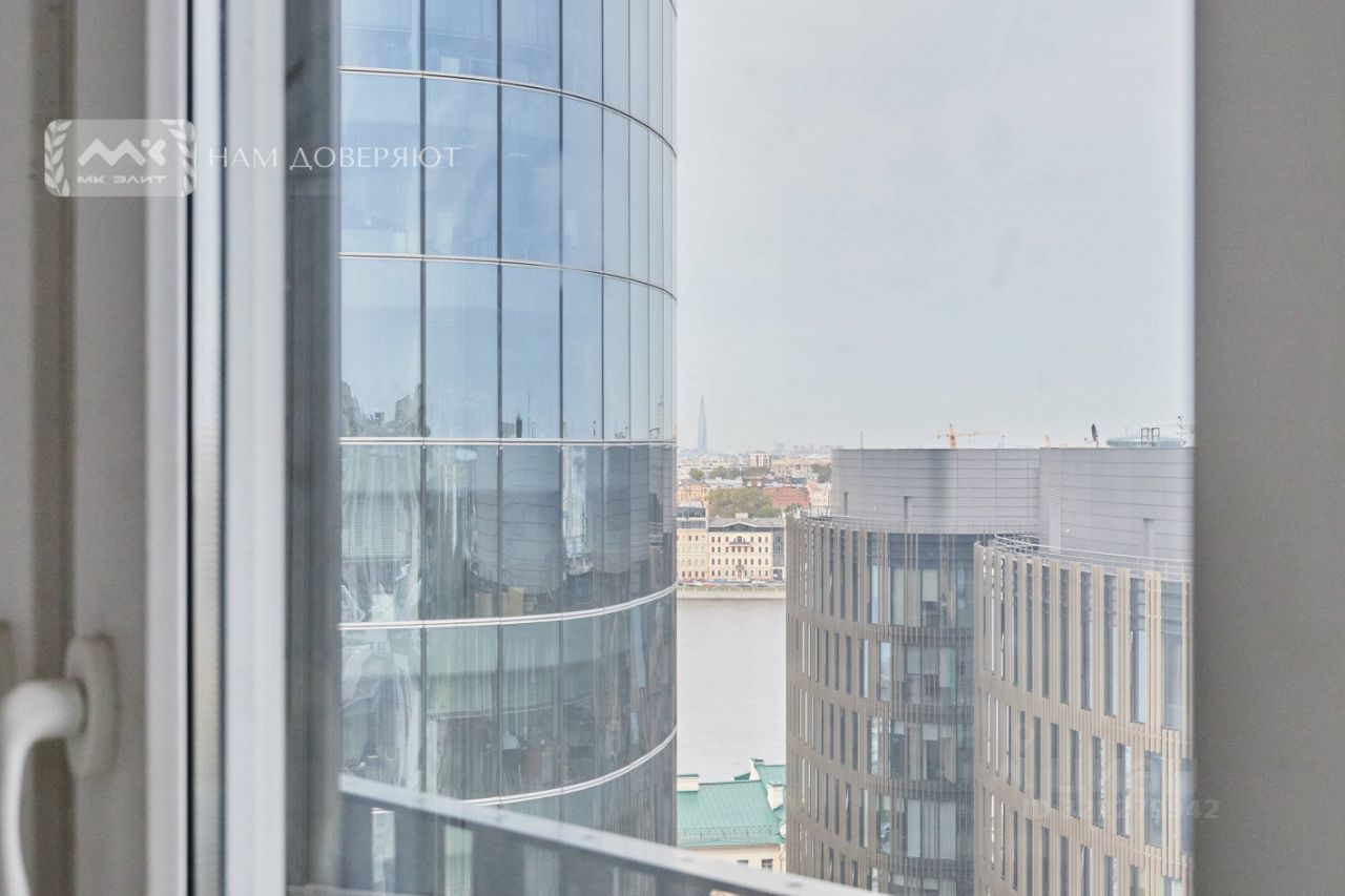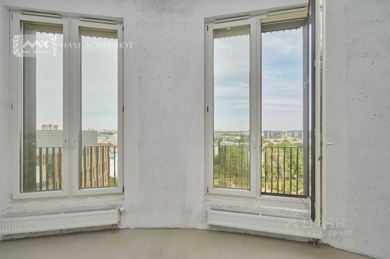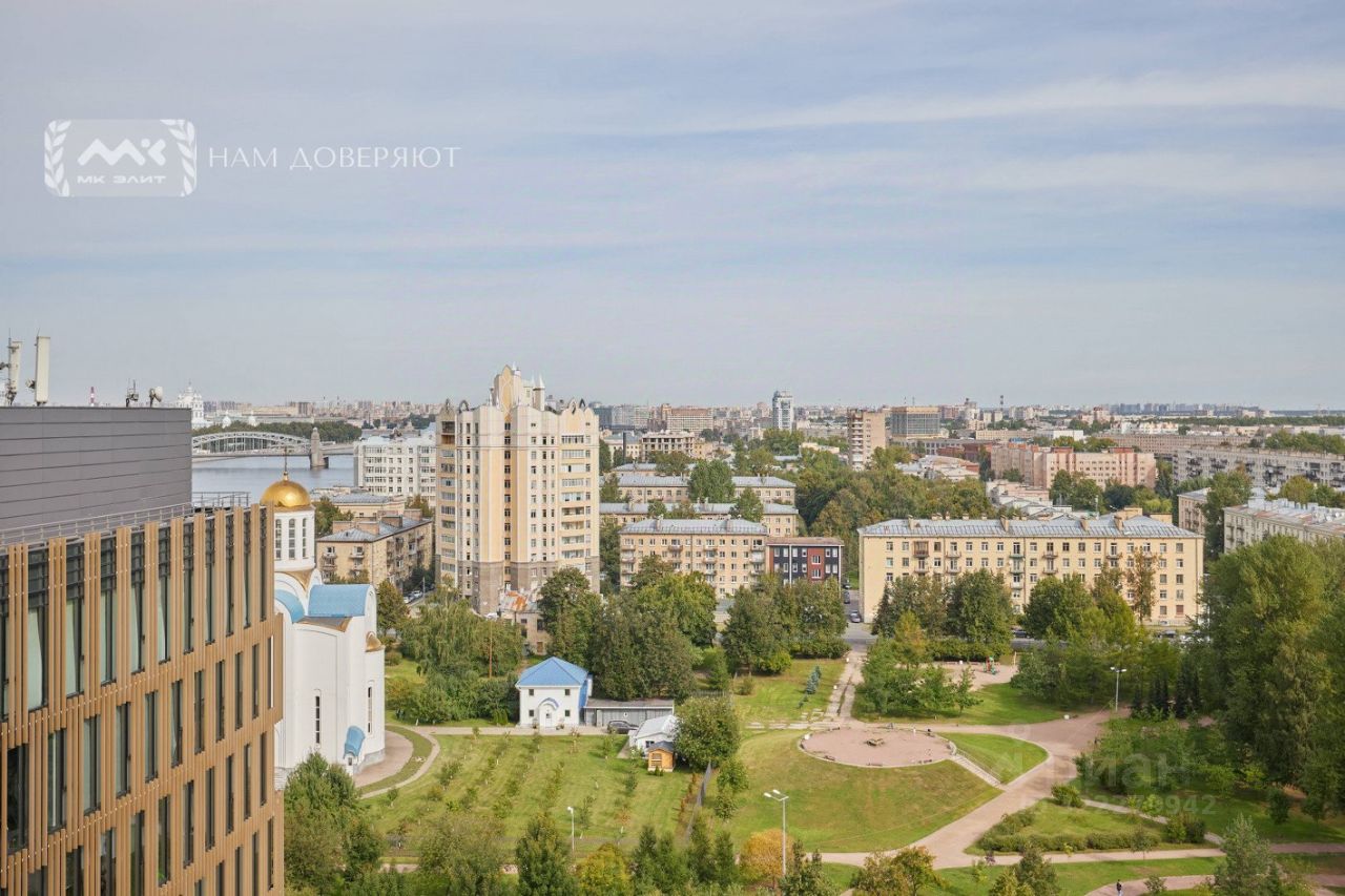 Квартира ориентирована на северо-восток. Много окон, много света, много воздуха. Вид на Неву, мост Петра Великого, парк, церковь и панораму города.
