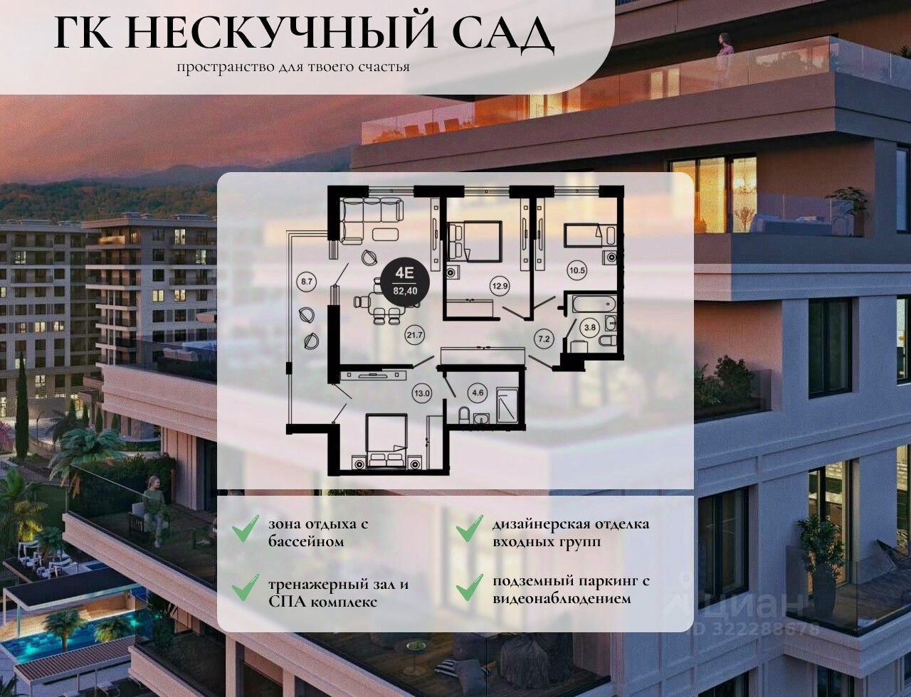 В проекте предложено множество планировочных решений: в наличии апартаменты, как классического типа, так и европланировки. Сдаются они без отделки и высотой потолков от 2.7 метров. Из окон номеров гостиничного комплекса ''Нескучный сад'' открывается неповторимый вид на горные вершины и Черное море.