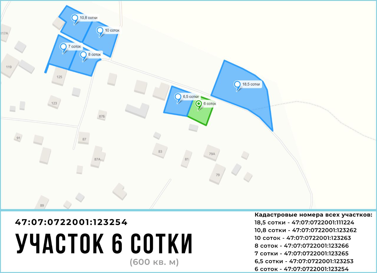 ОБ УЧАСТКЕ: - Площадь участка 600 м² - Кадастровый номер учаcтка: 47:07:0722001:123254 - Идеально подойдёт под строительство малоэтажного жилого дома.