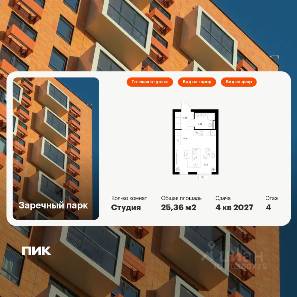 Продаётся квартира-студия площадью 25,36 кв.м на 4 этаже 24 этажного дома (Корпус 5, Секция 2) проекта ПИК Заречный парк. Светлый просторный подъезд на уровне земли, функциональная планировка, большие окна, c отделкой.