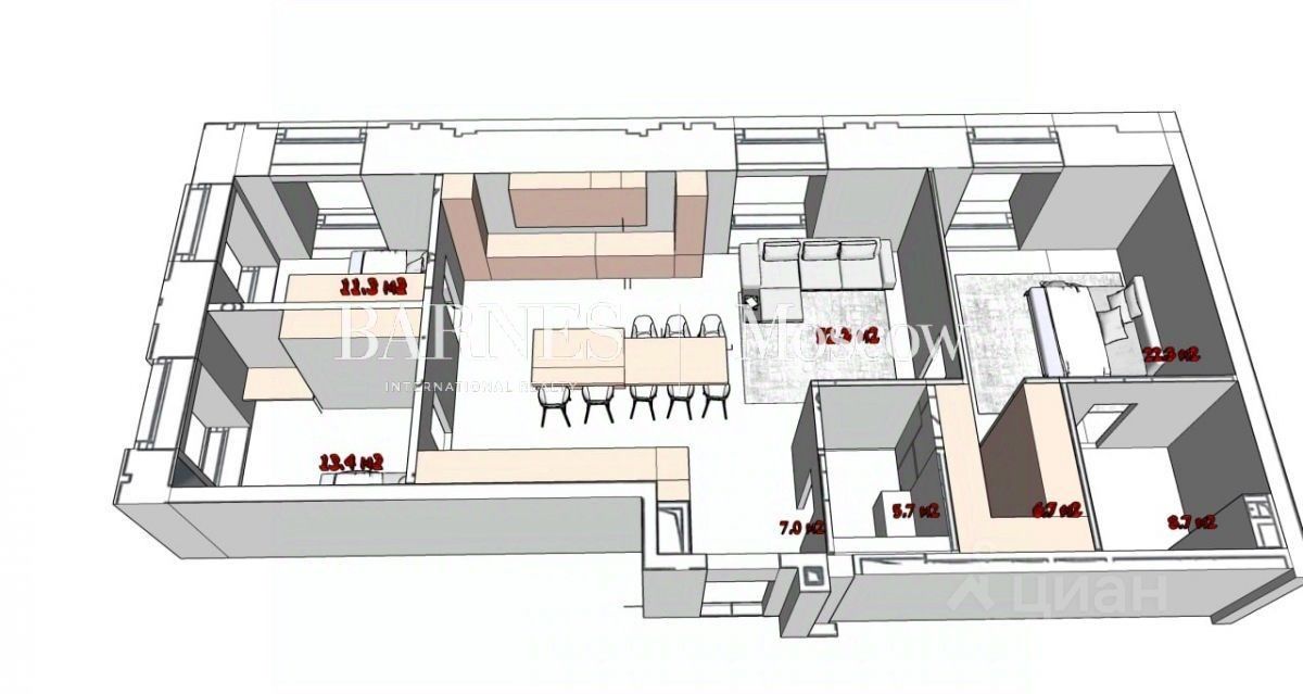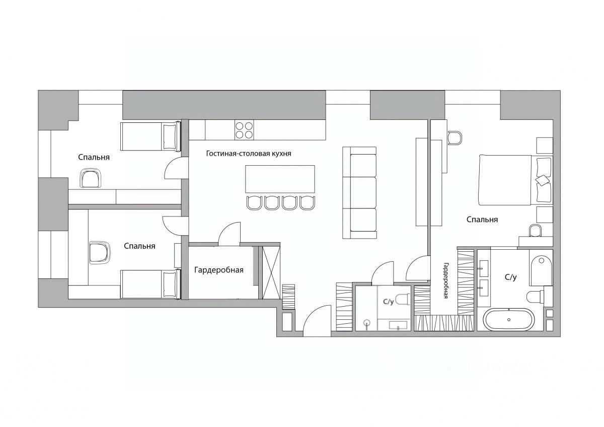 Квартира без отделки с возможностью разместить: просторную гостиную-столовую с зоной кухни, 3 спальни, 2 санузла, гардеробную, прихожую с гардеробной зоной.