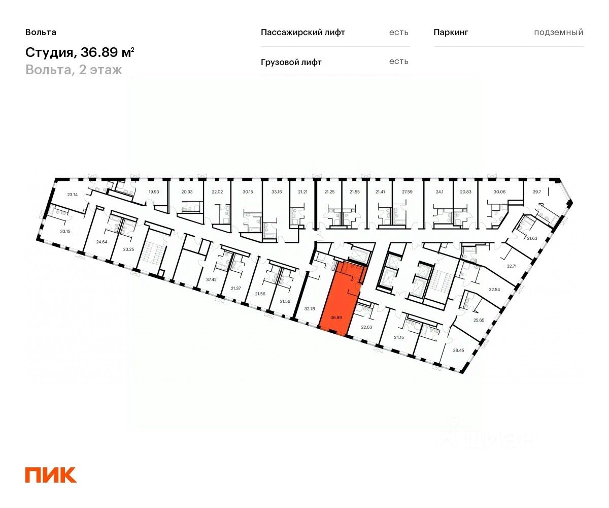 Продаются апартаменты-студия площадью 36,89 кв.м на 2 этаже 15 этажного дома (Вольта, Секция 1) проекта ПИК Вольта.