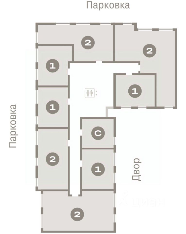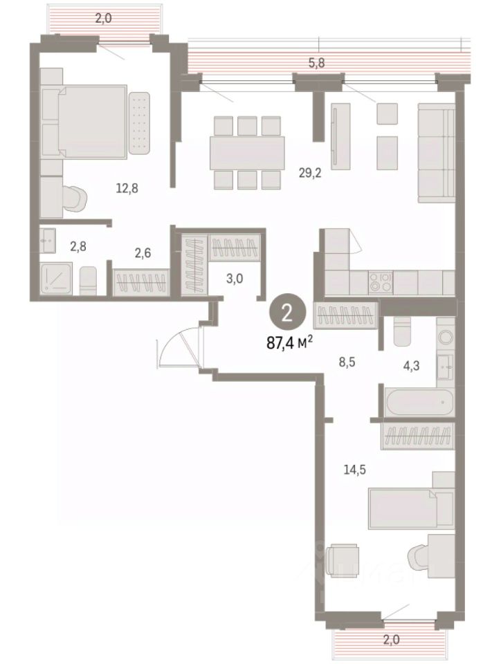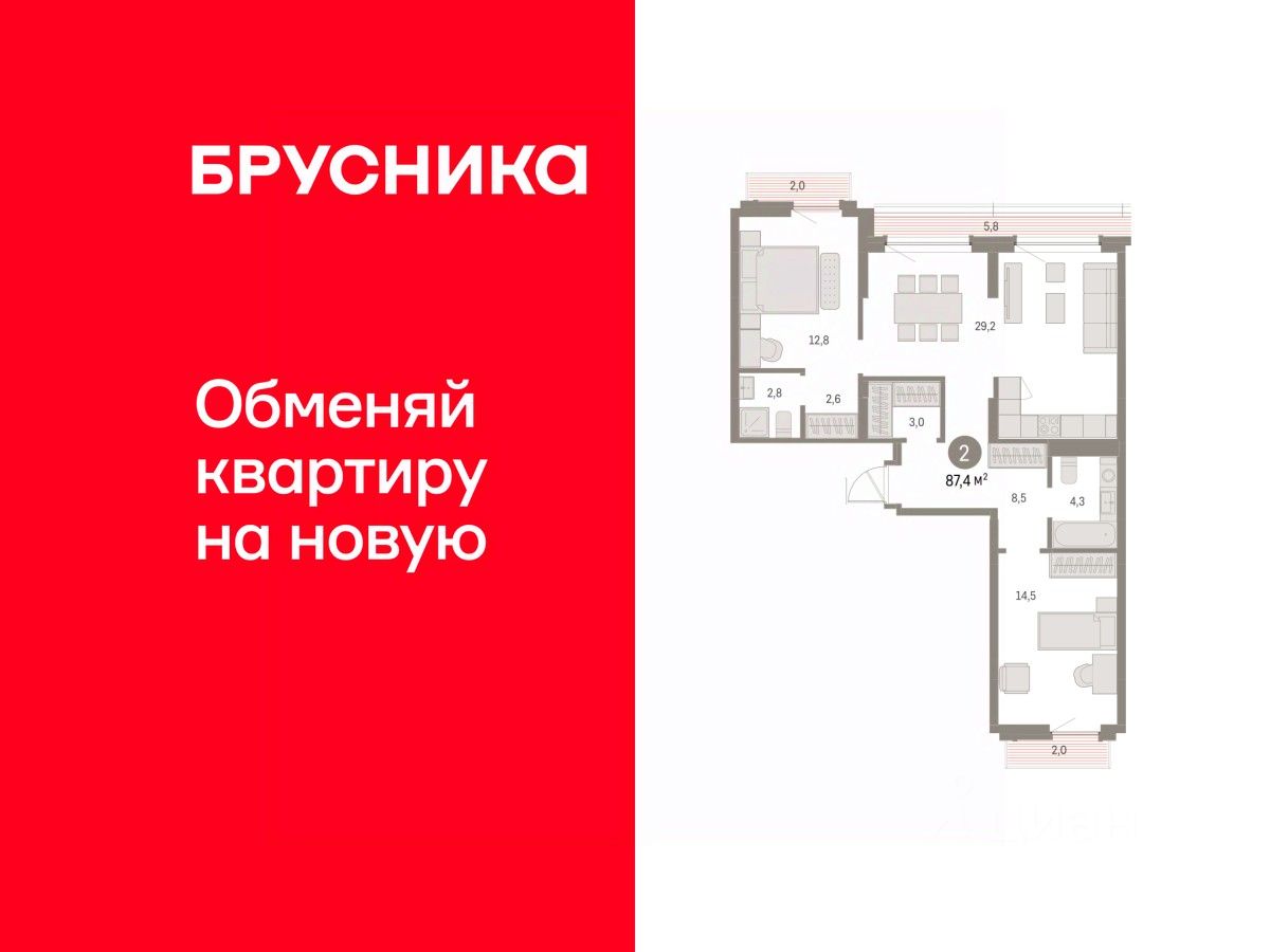 Квартира с кухней-гостиной и двумя спальнями в Бруснике в Академическом. Особенности планировки: балкон, окна на две стороны, предчистовая отделка, разнесённые спальни, терраса на крыше. квартиры в нашей базе: АКД05-Ж1.8.8.