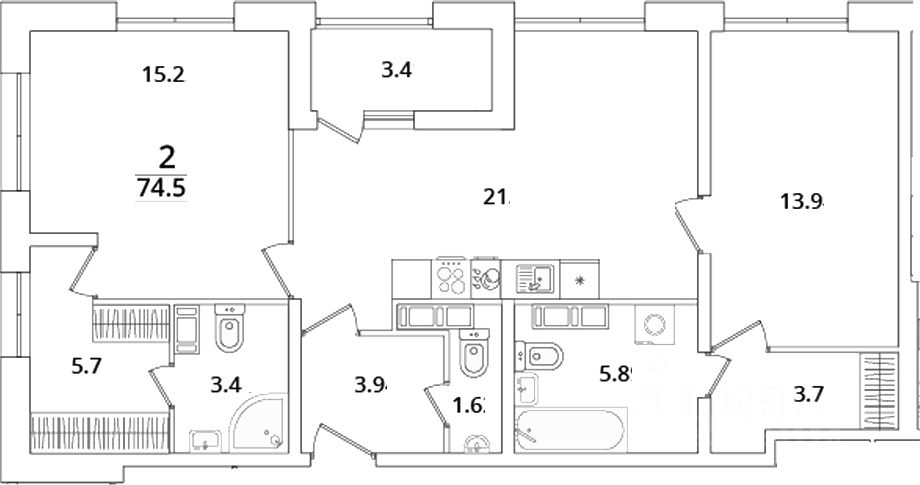 О КВАРТИРЕ: Общая площадь 74,5 кв.м., 3 санузла! Продуманная планировка. Кухня-гостиная 21 кв.м. с выходом на лоджию, просторные комнаты 15 и 14 кв.м. соответственно. Увеличенные окна. Черновая отделка. В паркинг можно спуститься на лифте. Окна на северо-восток и северо-запад.