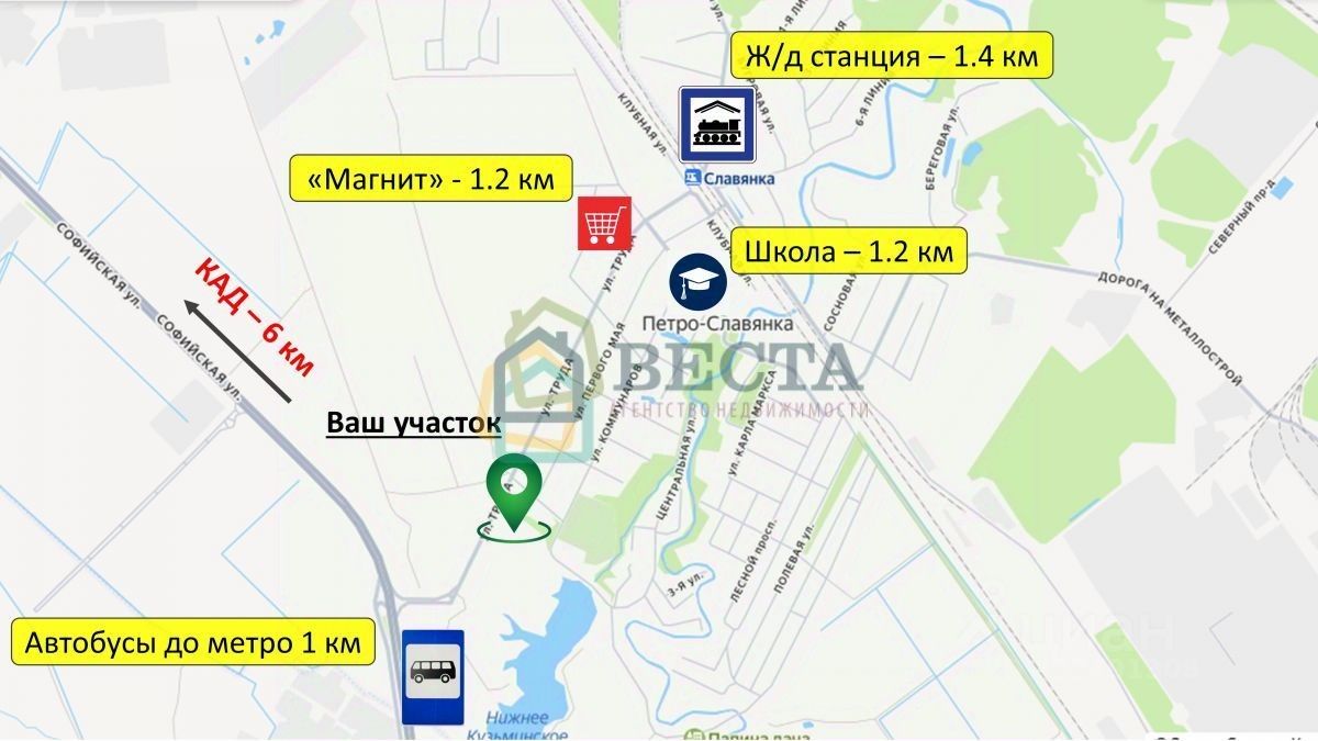 Выгодное транспортное сообщение относительно Санкт-Петербурга - всего 6 км от КАД на автомобиле. В 1.5 км - ж/д станция ''Славянка'' - всего 20 минут на электричке до центра Санкт-Петербурга. В 1км - остановка, с автобусами до метро Рыбацкое.