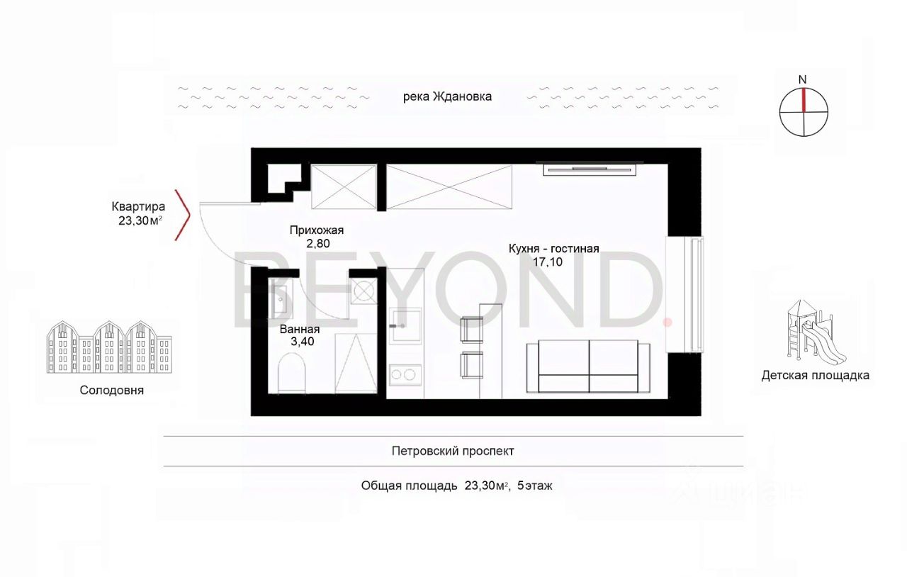 Площадь квартиры составляет 23,3 кв. м с продуманной функциональной планировкой, включающей удобную нишу под одежду при входе и просторную ванную. Высота потолка 3 м. Квартира расположена на пятом этаже девятиэтажного корпуса. В подъезде установлен бесшумный лифт Kone.