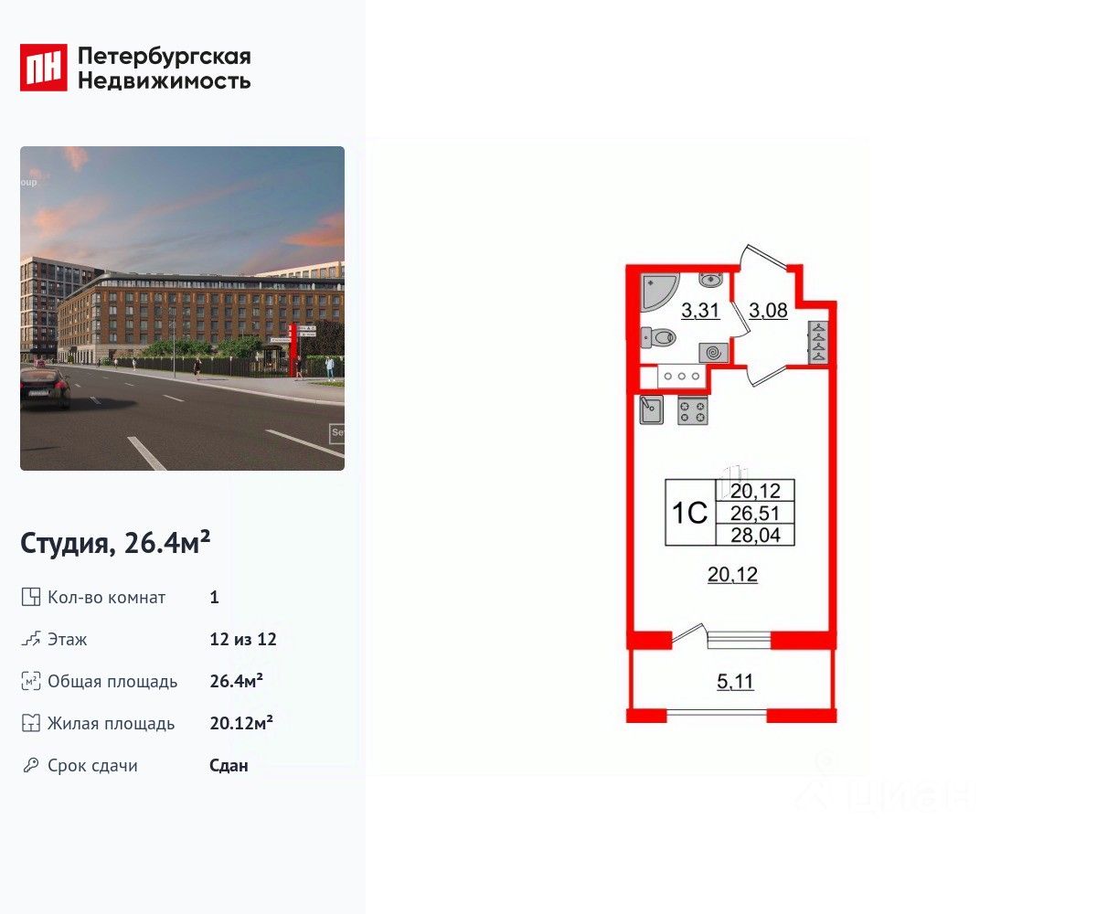 Удобная, классическая, функциональная европланировка, вместительная прихожая 3.08 м². Общая площадь студии - 26.4 м², жилая 20.12 м², высота потолка 3.06 м.