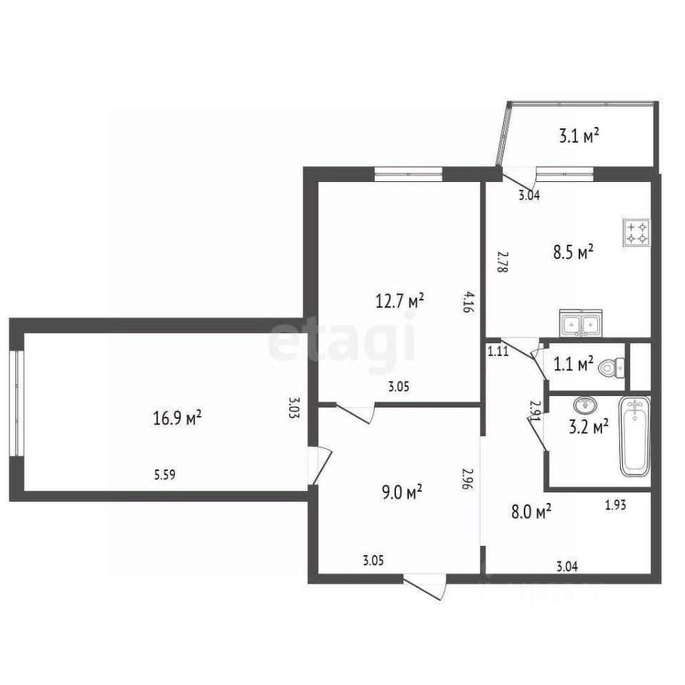 Планировка: Просторные светлые комнаты (16,9 и 12,7 кв.