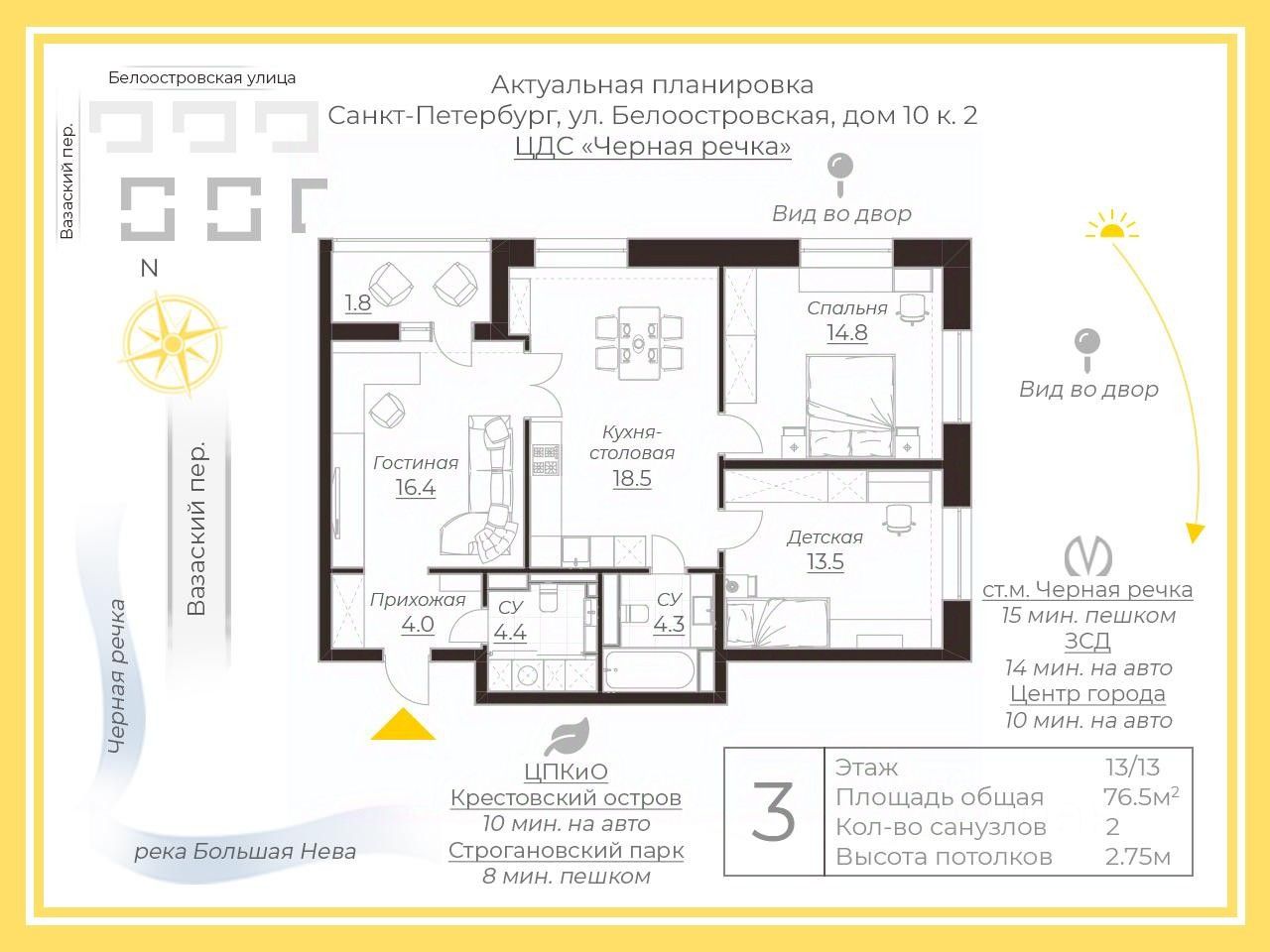 Арт. 117834801 Предлагается к приобретению квартира 76,5м2., на последнем 13 этаже. Большие окна позволяют наслаждаться завораживающими видами города. Река Нева, телебашня, Исаакиевский собор, шпиль Петропавловки, из спальни Лахта центр во всей красе. Окна на две стороны дарят квартире особую атмосферу — естественный свет наполняет пространство с утра до вечера, создавая ощущение воздушности и визуально расширяя каждую комнату. В квартире сделана основная отделка (white box), а точнее, заливка пола по всей плоскости, финишная штукатурка стен, в санузлах итальянская настенная и напольная плитка, электрика с большим функционалом. Есть готовый дизайн проект, который возможно до конца воплотить в жизнь! Сейчас реализовано две спальни, два санузла, удобная кухня-гостиная с лоджией, где приятно собираться всей семьёй. На сегодняшнем этапе ремонта , при необходимости и желании, возможно сделать три спальни. Инженерные системы нового поколения обеспечивают надёжность и экономичность эксплуатации. ЖК ''ЦДС Чёрная Речка'' предлагает жильцам насыщенную инфраструктуру. На территории есть магазины, кафе и салоны красоты, аптеки, что избавляют от необходимости далеко ехать за повседневными услугами. На территории построен новый детский сад и на следующий год планируется к открытию новая школа. Также есть подземный паркинг, круглосуточная охрана и видеонаблюдение. Станция метро ''Лесная'' и ''Черная речка'' находятся в шаговой доступности, а прямо через мост открывается вся развитая инфраструктура Петроградки с её зелёными парками, ресторанами и культурными объектами. Звоните, чтобы узнать детали и договориться о просмотре!