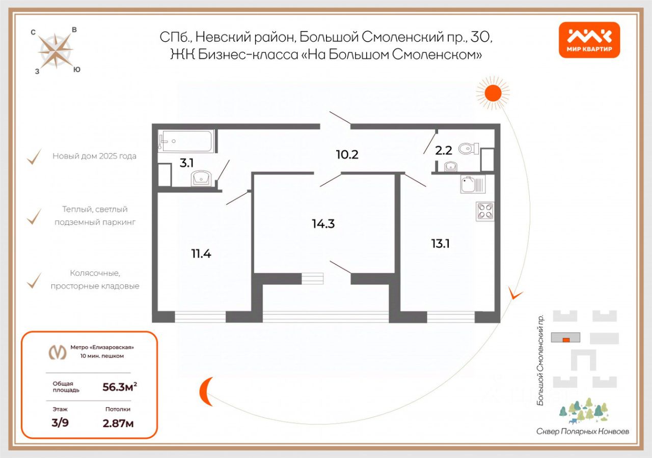 Арт. 118905439 Жилой комплекс ''На Большом Смоленском'' расположен в Невском районе Петербурга, всего в нескольких минутах ходьбы от метро ''Елизаровская''. Район активно развивается: здесь строятся современные жилые комплексы, появляются новые парки и объекты инфраструктуры, что делает локацию всё более привлекательной для жизни и инвестиций. До Невского проспекта на автомобиле всего 9 минут.