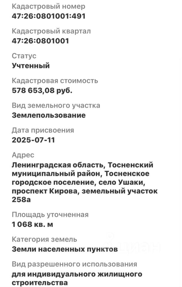 Срочная продажа! Цена самая низкая В прямой продаже отличный земельный участок 1068 кв. м. (10 соток), расположенный по адресу Лен обл., Тосненский р-н, с. Ушаки, пр. Кирова, 64В Кадастровый номер 47:26:0801001:491 Возможен самостоятельный просмотр участка в любое удобное для вас время (напишите мне - расскажу как доехать до участка) или со мной по договоренности. Координаты местонахождения участка для навигатора: 59.477572, 30.989704 Копируете, вставляете в поисковую строку Яндекс навигатора и вы на месте. Категория земель: земли населенных пунктов Вид разрешённого использования: для индивидуального жилищного строительства (ИЖС) Это значит, что МОЖНО ПОСТРОИТЬ ДОМ И ПРОПИСАТЬСЯ В НЁМ Участок ровный и высокий. Дорога идет до самого участка. Можно подключить электричество 15кВт от Ленэнерго и провести газ газ Хорошая транспортная доступность - до Тосно 10 мин, до КАД примерно час По документам: один собственник, прямая продажа, межевание сделано (можете посмотреть на публичной кадастровой карте) Без арестов, долгов и без обременений Как купить : за наличные, в ипотеку (даже без первого взноса, помогу с одобрением), земельный сертификат и др. Инфраструктура: В Ушаках в шаговой доступности остановка автобуса, ж/д станция, Магнит, церковь, ПВЗ Вб и озон, гостиница, парк.Рядом город Тосно, где есть всё для комфортного проживания: вокзалы, ТЦ, фитнес зал, бассейн, школы, детские сады, поликлиника, больница, МФЦ, парк, детские площадки, прогулочные зоны, магазины, спортивные объекты, кинотеатр, скейтпарк, отделения банков, библиотека, творческие центры, ДК и др. По любым вопросам звоните или пишите