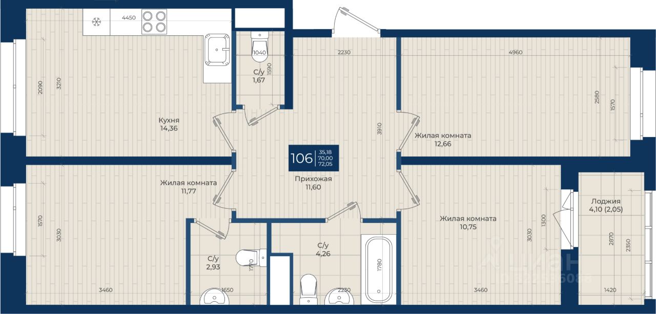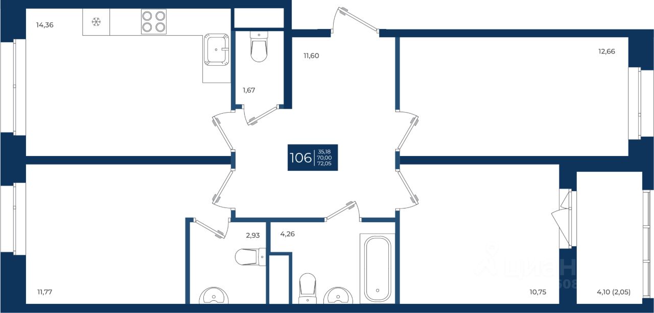 Жилой комплекс ''Новатория'', 1 очередь строительства, Корпус А, Квартира 106 общей площадью 72,05 м2 на 5 этаже.ЖК ''Новатория'' —жилой комплекс комфорт-класса расположен в поселке Новоселье, в окружении леса и Шунгеровского заказника.